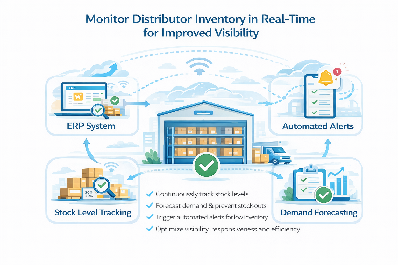 Real-time monitoring of distributor inventory involves continuously tracking of stock levels, providing up-to-date information for better decision-making. This optimises stock levels, forecasts demand accuracy and prevents stock-outs by enabling proactive measures. Automated alerts streamline replenishment processes, ensuring timely restocking. In summary, real-time inventory monitoring improves supply chain visibility, responsiveness, and efficiency