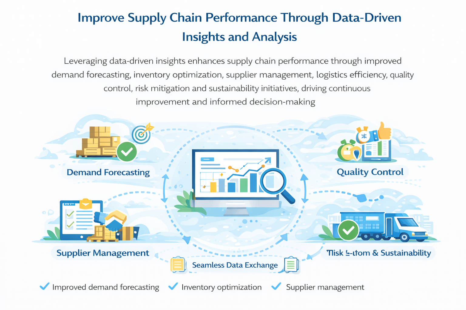 Leveraging data-driven insights enhances supply chain performance through improved demand forecasting, inventory optimization, supplier management, logistics efficiency, quality control, risk mitigation and sustainability initiatives, driving continuous improvement and informed decision-making.