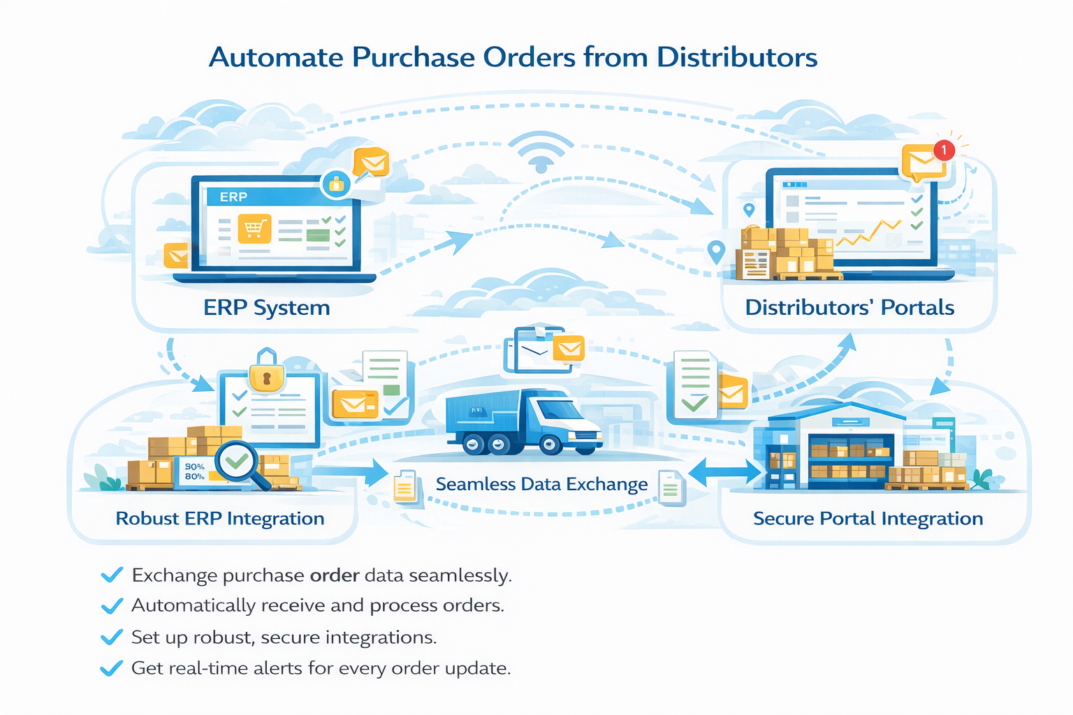 Seamlessly exchange purchase order data between your internal ERP systems and distributors' portals, establish robust connections and implement automated, real-time alerts and notifications for every order update